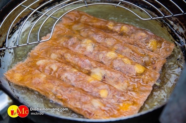 Bánh tráng chiên nè! Chảo dầu sôi lên là thả vô, rất mau giòn nha. ...